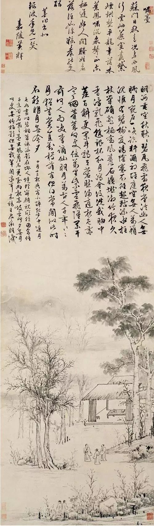 《中庭步月图》乃明代大家文征明的晚年佳作。全图纯以水墨绘就,似月色漫染,笔墨清润。画中跋文记叙了本图的创作缘由:嘉靖十一年(1532)十月十三日夜,文征明与学生朱朗宴饮,醉酒后于庭院内漫步,欣赏月色皎洁、桐影摇曳的佳景。题诗则记录下文征明赏月时的心境。此图画境悠然,诗文清新,书风洒丽,传达出旷达超脱的人生态度,生动反映了文征明诗画人生的一个侧面。