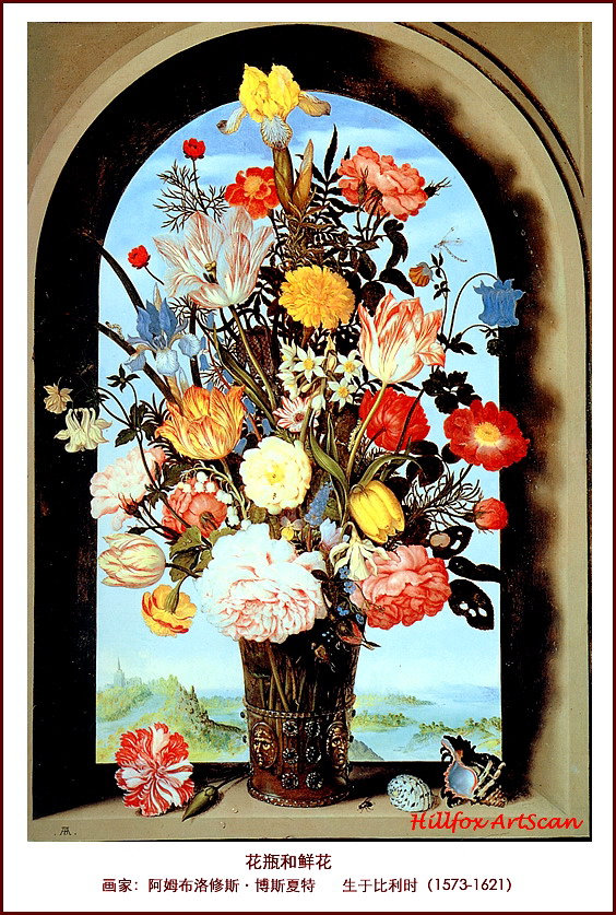 据说鲁斯奇•拉切尔在创作这幅作品时只有20岁刚出头,然而她的目空一切已经暴露无疑。她拒绝过分的规则,花朵松弛地仰卧着,斜向着从左下方下垂的茎伸向右上角的一束草中。花好像在抵制一种限制,画家在描绘画面中的昆虫带着一种讽刺的意味,因为随着这种小虫的移动,对于花唯一的逃跑方式是一片花瓣、一片花瓣地凋落。这样一种运动形式吸引了周围不寻常的画家。
