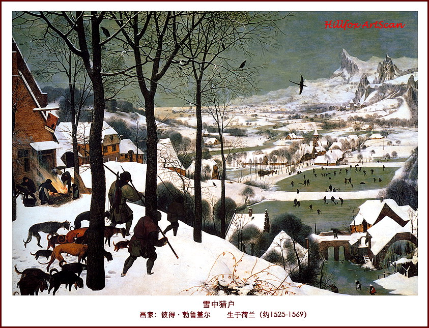 彼得•勃鲁盖尔的绰号是“农民勃鲁盖尔”,因为他的绘画总是表现那些生活在自己土地上的农民,他自己则是一个非常老练的人,明白什么才可以被看作是土地的精髓,这使其成为最为伟大的风景画家之一。《雪中猎户》也许是他所创作的作品中场景最为寒冷的一幅:疲倦的人们深深地陷入到这有着易碎表层的冰冷世界,消瘦而沮丧的狗跟在后面。勃鲁盖尔深深地感受到了加在农民身上的束缚,这使得他们被长久地、疲惫地绑缚在对于生活的渴望之上。鸟儿在自由飞翔,而这些冰上的小小的人影却被强迫在他们的工作岗位上,意识不到生活还有其它可能的形式。这是一幅奇特的北方景象,而不是他那平坦的弗兰德斯风光。但这是一个可以登高远望的理想世界。勃鲁盖尔引导着我们顺着这些垂直的树到达了山下,进入山谷,然后又出来,一个巨大的山峰又将我们引向天空。在他的意识中好像有着一种淡淡的忧伤,似乎是他自己在那深邃的山谷中摸索着前行。