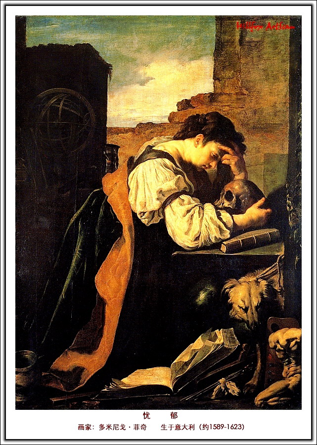 多米尼戈•菲奇是一位高度原创的画家,但是他在30几岁时就不幸早夭,我们因而也就永远无法一睹他的全部天才。《忧郁》创作于他生命的晚期,这或许是一幅预言式的绘画,令人想起丟勒伟大的蚀刻画《忧郁-1》,在那幅作品中,“忧郁”不是简单的“压抑感”,而是被赋予了深刻痛苦的挫折感。菲奇的《忧郁》孤独地沉浸在一幅分崩离析的、贫瘠的、阴郁的土黄色景色之中。他的注意力集中在那颗毫无疑问是寓意着死亡的骷髅上,像是在提醒人们,我们获得的一切都是转瞬即逝的。画中的女子被笼罩在想像力之中,这不仅强调着创造的威力,而且也强调着人们对业已获得的一切已失去控制。作品里有一幅画,一本卷了边的书,几枚废弃的天文学徽章,还有一只一般人未必会留心注意的圆球。《忧郁》的主题是由人类本质上的孤独感以及按照愿望去生活的能力所构成的——自由是一种祝福,也是一种责任。画中的女子美丽,富有,智慧,而这些不是她此刻拥有的,恰恰是她想拥有并一直困扰着她的。