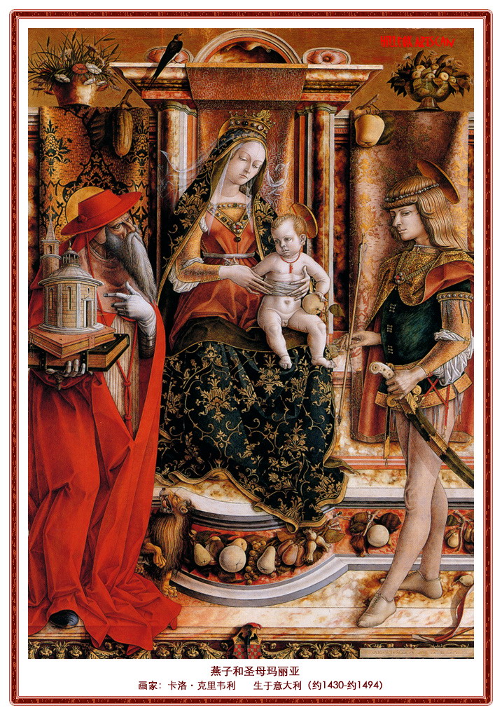金色的背景使我们意识到这不是现实,只是一个幻境。但那圆圆的意大利式的脸庞的丰满和精致却表明,与其说这是天国的形象,不如说这是一位常有的女士。圣卢西金发上的整洁的帽子及围绕在她脖子上麻P的褶边构成自我感觉良好的年轻脸庞。与她深邊色袍子相应的深沉的描绘与笔触相对轻快的头巾形成对比,而围绕在她腰间的可以飘动的可爱的缎带,和从她腰间垂下的不能晃动的绳子,又形成优雅的对比。