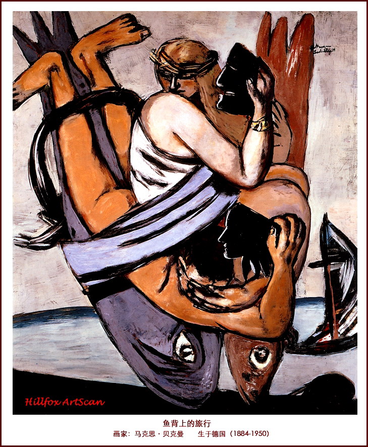 鱼背上的旅行,1934年,油画颜料绘于画布上,135x116cm,斯图加特,国家美术馆。贝克曼大约画了80幅自画像,只比伦勃朗少一点,但是贝克曼不是像伦勃朗那样,因为自负才画这么多画像的。这两个艺术家都真诚地追问着自己是什么,也就是向自我解释自我是什么。贝克曼走得更远些:他似乎不仅仅想知道他自己是什么人,还想知道他自己是什么“东西”,以确定自我的存在。甚至类似像《鱼背上的旅行》这样令我们震动的超现实主义叙述,在另一个层次上也变成了他的自画像。那个高大的蓝色男人,和那个苗条的灰色女人,是一对被绑在鱼背上的情人。男人四肢舒展地躺着,把头藏了起来,女人则蹲在他的背上。男人拿着一个女人用来面对社会的面具,同时,女人手里也拿着一个面具,不过那是贝克曼的脸,巨大而且充满恐惧。男人真正的脸藏了起来,但女人真实的脸却展示给我们,她的脸比那个面具要美丽的多。鱼刚从海面上跃起,现在正弓着背准备再次回到它们那黑暗的海底世界。这对情人背对着船上来自人类的安全感,但却把自己交付给了他们那奇怪坐骑所熟悉的深深海洋。