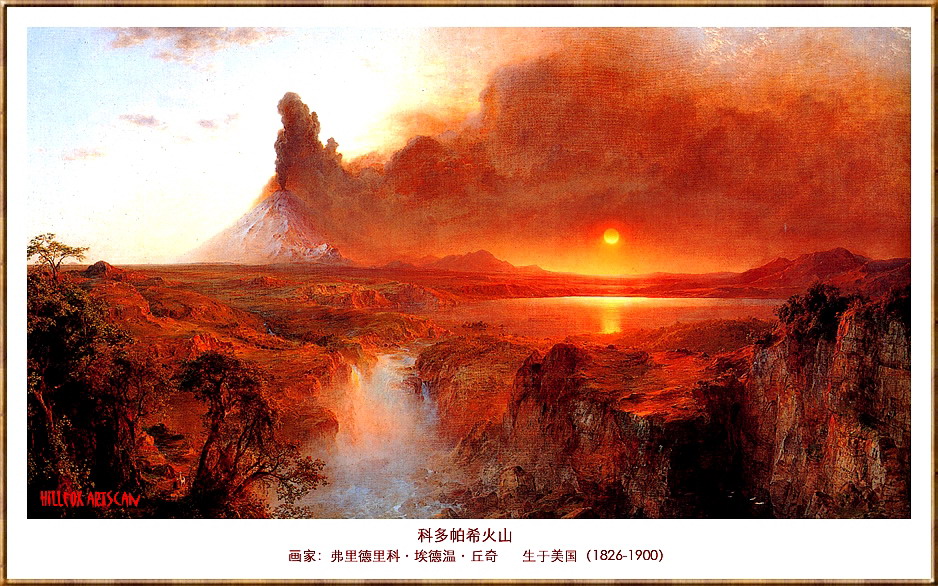 科多帕希火山,1862年,油画颜料绘于画布上,122x216cm,密执安,底特律艺术博物馆。丘奇在19世纪风景画家中颇不寻常,因为他的想像不是产生于自己的国度,而是由南美的奇景激发出来的。这些土地对于一个美国公民来说是陌生的和几乎是野蛮的,它们的历史与印加和阿兹台克相联系,它们的地理环境与火山相联系。南美的环境是奇异的、引人注目的,后来被压缩在格兰特•伍德著名的“美国哥特”中。《科多帕希火山》这幅画描绘了安第斯山的一座活火山。这幅画第一次公开展出造成了巨大的冲击。展出的日期是一个有趣的巧合:1862年正值美国内战的早期,当时美国正在与蛮荒作战。对那些观赏这幅伟大作品的人来说,很难不把火山的反复无常看成是对美国社会的隐喻,另一方面则是火热的狂暴和苦病的迸发。