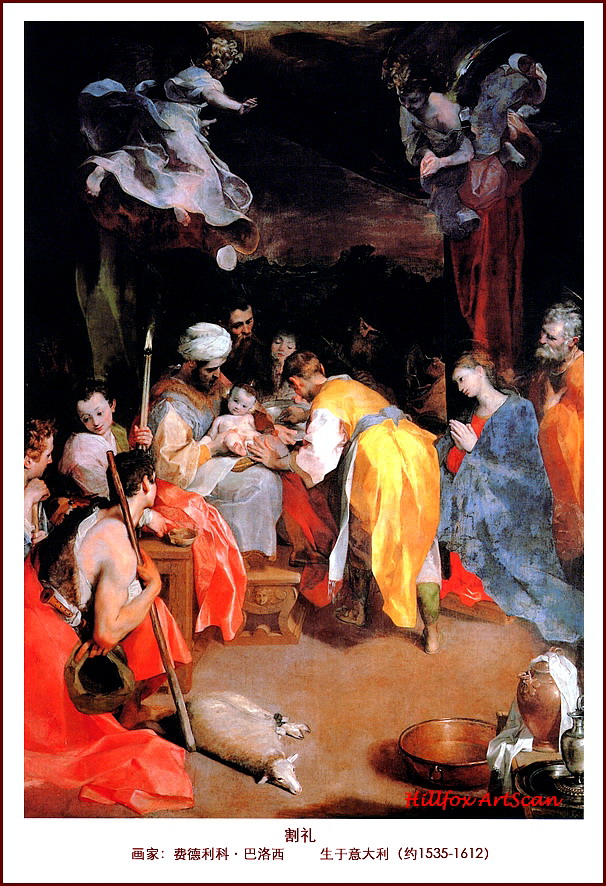 割礼,1590年,油画颜料绘于画布上,356x251cm,巴黎,卢浮宫。巴洛西原本是位宗教艺术家,但并不是一位举足轻重的人物。他对那些表现殉道者所具有的富于震撼力的拼死挣扎,很少表现出兴趣,却喜欢表现由精神交流所带来的愉悦。他赋予这个圣家族一份特别的礼物,使其更增加了一些人情味,作者的细腻、富有魅力、彩虹般的色彩,给予了他的绘画不同一般的吸引力。“割礼”是一件值得纪念的事件,每一位年幼的犹太男孩都要被仪式性地割除包皮。这里,我们看到祭司正抱着快乐的小耶稣,他的圆圆的小脸侧向我们,在等待被刀割的时候显得有些滑稽——这似乎对后来的以及整个教会的流血是一个象征。割除包皮的人,衣着灿烂的黄色长抱,实施着手术,而玛丽亚并没有加入这个场景,富于同情而痛苦地观看着:另一个情绪激动的人物是圣•约瑟夫,他则把手放在胸前。巴洛西同样情绪激动,作品的格调控制在这样一个层次,情绪的激动可以被接受,但又不致感伤。光亮耀目的色彩为画面增加了一些情绪化的效果。
