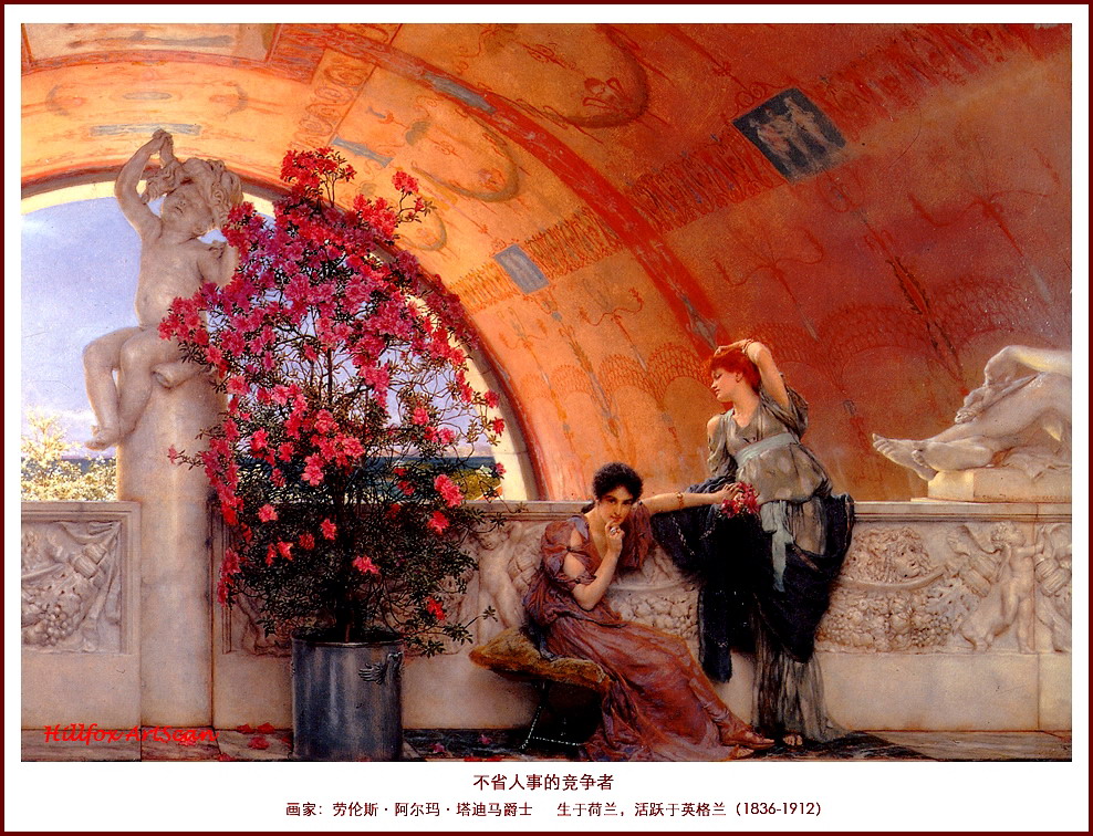 维多利亚时的上流社会的男学生们除了拉丁语和希腊语之外,别的基本什么都不学。阿尔玛•塔迪马以其内容为这些客户创造了他自己对那失去的古典世界的召唤。他十分严肃地对待历史的准确性,但是我们仍可以看到他将历史与浪漫感情相混合。那过去的世界、它的大理石雕像、角斗士以及帝国的罪恶萦绕在女王维多利亚的不列颠帝国的想像中,而且不管阿尔玛是否真正准确地描绘了这段历史,至少他自己觉得是这样,而且觉得这种题材非常适合他自己的表达方式。在这幅画里,他表现了两个处于极度奢华场景中的美女,并且暗示着这座在那不勒斯附近建造的令人愉快的罗马别墅中的每一个女孩都沉浸在对性爱的幻想中,等待着,从那奢侈的场景中暗示着她们正在等待着情人。