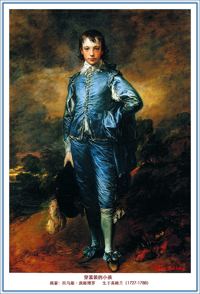 每个人都认为自己懂得庚斯博罗《穿蓝装的小孩》这幅画的含义。依大众的看法,这是幅年轻贵族的画像,过分考究的打扮,直面平民的世界。实际上,《穿蓝装的小孩》描画的是琼纳森•巴图尔,他是画家的朋友,一位五金商的儿子。从理论上说,他只是个十分普通的孩子,在当时的情况下是为帮助画家研究蓝色的丝绸、银色的金属片和羽毛的华美而服务的。但使这幅画如此难忘的是,实际上,庚斯博罗不是只将琼纳森看作晾衣架一样的东西去描绘,当这孩子充满了温暖爱意地站在他面前时,他对此现实报以了相应的回应。他将这孩子置于一个虚构的浪漫的环境中,可能试图去说明那年轻贵族拥有的广袤的领土,但画家越是注视年轻人严肃、坚毅的脸庞,他越是对琼纳森•巴图尔作为一个人——一个有自己立场和人格的人越感兴趣。