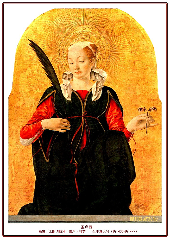 来自费拉拉的艺术家们似乎都拥有敏锐的捕捉力,从而使他们的作品重点突出,并具有感染力。科萨就是他们中的一员。圣卢西是那些所有眼睛有病的人的守护神。传说中她双眼失明,科萨通过刻画她手中的物体来表现她:她一只手中拿着具有深远意义的棕榈叶,它象征着她的殉道精神,另一只手拿着视觉发明器——这是一枝发着两片芽的茎,每片芽实际上是一只眼睛。这可以说给人物形象添加了超现实主义的一笔。人们会不由自主地把目光投到她苍白的脸上,当看到她的眼睛时会如释重负地叹一口气。她的双眼实际上低垂着,并斜眼看着手上由她漫不经心地拿着的神秘的植物。没有什么看上去和圣卢西的神态相似的。她的一只膝弯屈着,而另一只膝则抬起,把人们的注意力引向那只背后画着不吉祥的花的手上。