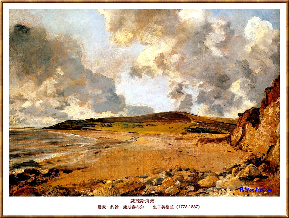 康斯泰布尔钟情于对自然景物的描绘,他十分热爱这片熟悉而亲切的土地,并充满着美好的记忆和无限的激情。威茅斯海湾虽然不是他童年时的家(萨福克——他的家乡,风景宜人,令人难忘,在《干草车》和《玉米地》中被描绘出来),但对他依旧是非常珍贵而且亲切。他曾与他心爱的妻子玛莉亚在此共度美好时光,爱妻的早逝给他带来沉重的打击。如此壮丽的风景画只有充满超强信念,有远大抱负的艺术家才可能绘制成功。他不需要一些小的细节使景色更富有生机;有一个白色的人物影像突出出来,在右侧站立着,但是他的存在几乎没有引起人们的注意。康斯泰布尔所有的注意力完全集中在那渐渐隆起的小山上,荒芜的沙地向四面延伸直到小山脚下,当潮水缓缓流过时,可听到优美的冲击声。这幅画最大的特色是对天空的描绘,广阔无垠的淡蓝色天空,上面黑云正在集聚,阴沉而忧郁,但给这幅画一个十分清晰、鲜明的背景。