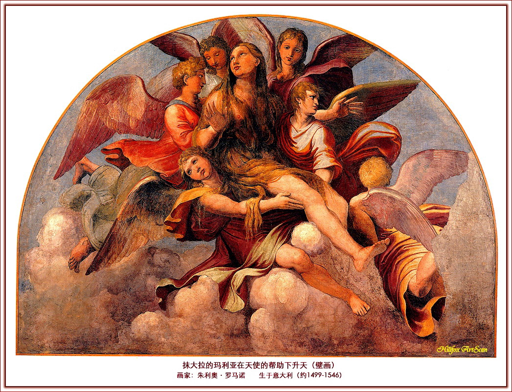 抹大拉的玛利亚在天使帮助下升天,约1520年,壁画,165X236cm,伦敦,国家美术馆。传说在基督复活后,抹大拉的玛利亚一直赤裸着生活在沙漠中,直至死去。天使领她上了天堂。朱利奥•罗马诺带着一种无意识的诙谐来描绘这一情节。当天使们将这个女人带往天堂时,他们形成一个飘浮的椅子,并且像在空中的消防队员一样举着她。抹大拉的玛利亚似乎并没有意识到天使的存在,只是充满渴望地望着天堂。然而,天使脸上的表情缺乏对于这个神圣的责任的热情——他们既不像有着愉快的表情,也没有表现出对这个任务所感到的荣耀。环形的构图像是一个车轮,翅膀和腿像是在每一个方向旋转。有浮力的云朵给天空的运动提供了宜人的感觉——这天空是天使们所熟知的领域,但对于抹大拉和我们来说,则仍然是兴趣的源泉。