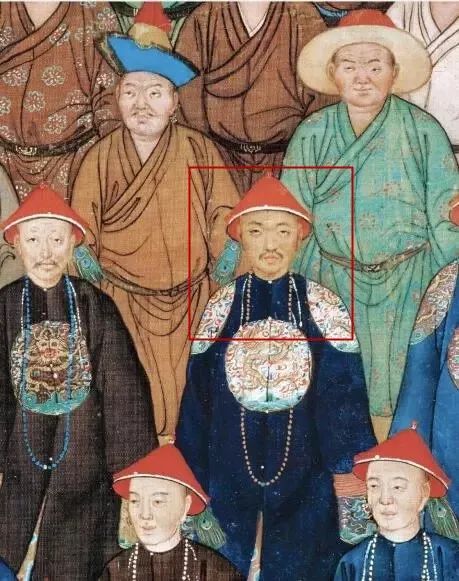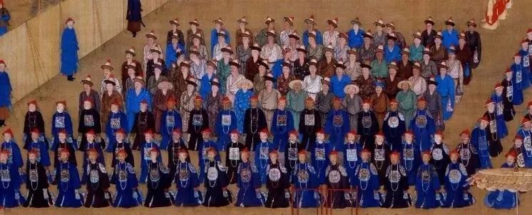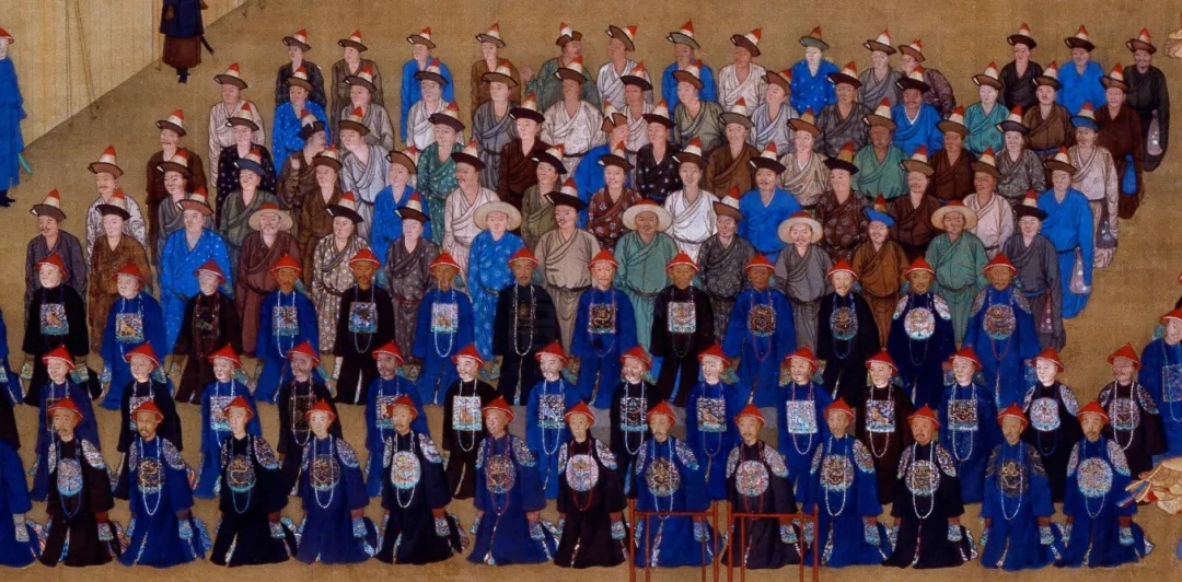 在画面的左下方,乾隆皇帝在文武官员簇拥下,缓缓进入宴会场地。3位前导武官走在队列最前方,其中一人手持云龙黄伞。有两位官员紧随其后,再后面是由二品文武官员组成的两列纵队。紧接着,前后各有8位舆士抬着紫檀雕花步辇,乾隆帝趺坐其上,头戴夏冠,身穿明黄色龙袍,外罩石青色四团龙衮服。舆士身穿小团花红色长袍,以绿带束腰。乾隆皇帝的两侧和后面有手执曲柄华盖、弓矢的扈从、官员、侍卫30余人。园内众人纷纷下跪迎接。宴桌东西两边相对而跪的是亲王至文二品大员,各两排,共54人。西边面向皇帝跪拜的人群中,前三排是亲王、郡王、贝勒、贝子以及文武一二品官员共49人,后五排是入觐的少数民族部落首领及随从共70人。