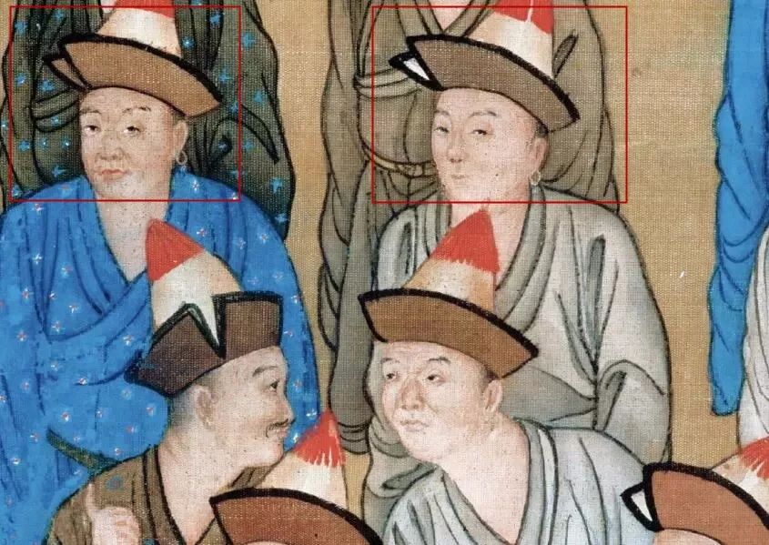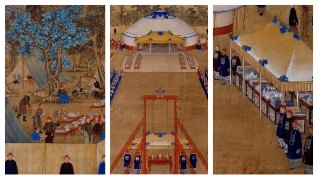 《万树园赐宴图》局部,分别为黄布幕围之外的若干杂役(左)、庑殿顶三楹门的蒙古包式帐殿(中)、东侧庑殿顶垂幔的帐篷(右)。