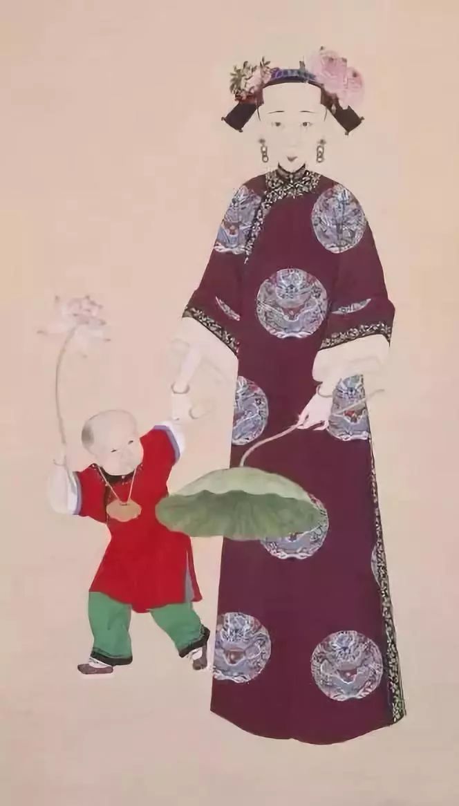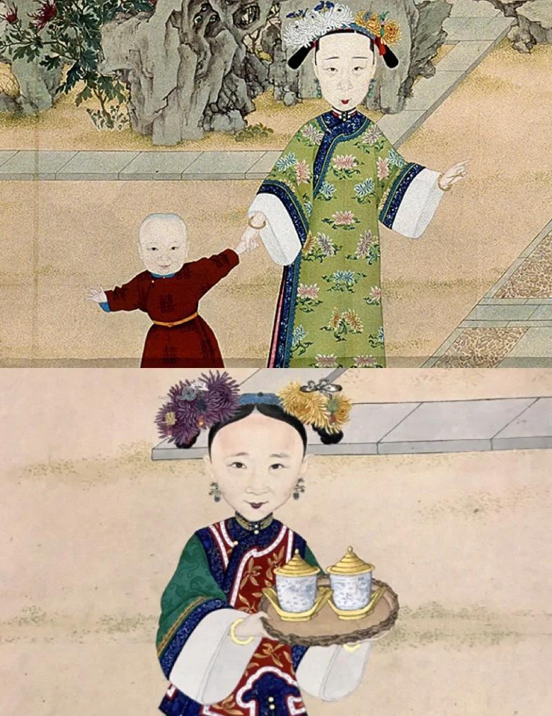 游廊前石阶处,四阿哥奕詝正在和大他一岁的六公主玩耍。两人都只有三四岁,姐弟俩手舞足蹈,叽叽喳喳地逗着两只哈巴狗,还不时咬几句耳朵,憨状可掬。在画面的左前方,是蹒跚学步的六阿哥奕。奕年初刚刚出生,不满一岁,所以年仅二十一岁的生母、静贵妃博尔济吉特氏牵起了小奕的手。显然,奕对身后的小哈巴狗更感兴趣,试图挣脱母亲的牵引。而在画面最左边、奕母子身侧的是三公主。当年三公主已经九岁了,按宫廷的要求,这个年纪的公主不再是一个小孩子,要开始女德培训了。所以,三公主不苟言笑,手托茶盘,准备往游廊向父母敬茶。画面右侧有一位在花池边赏菊的女子,应该是与静贵妃身份地位、年龄相仿的某位皇妃,因为旻宁的宠爱才出现在画中。