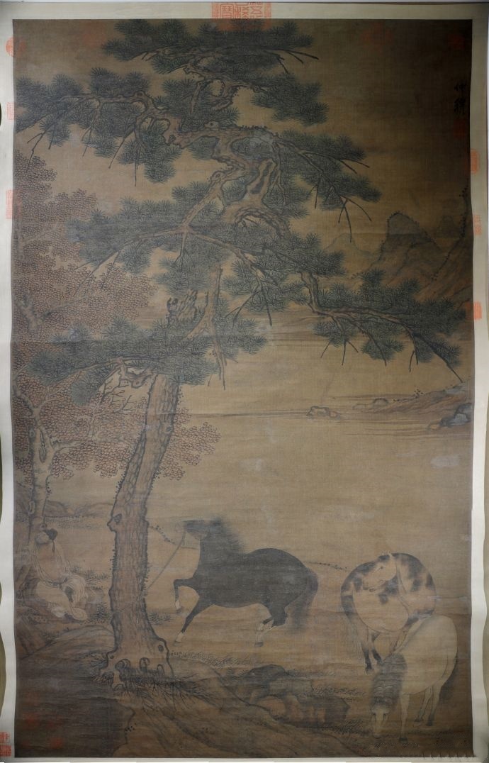 元 赵雍 长松系马图 绢本 立轴 设色 102.9x63.1 厘米,上海博物馆藏;