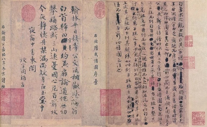 欧阳修《谱图序稿》,实际上包括《欧阳氏谱图序》和《夜宿中书东閤》七律一首。从跋文中可知前者作于至和二年(1055),作者时年四十九岁,后者作于嘉祐八年(1063),时年五十七岁。