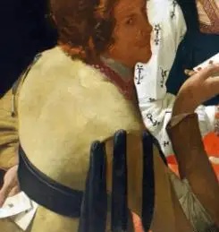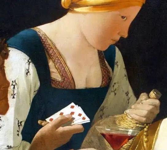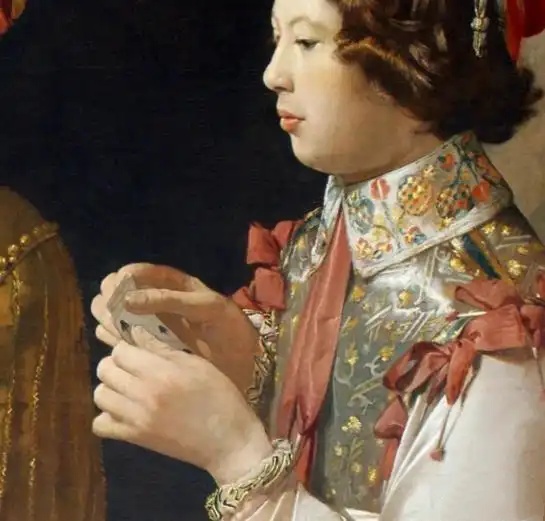 《方块A的作弊者》呈现出四个成年人的场景,三女一男围坐在桌前。三人正在打牌,而一位女仆端着美酒为女主人倒酒。仔细观察可发现,画作左侧的男子手持方块A,显然是个作弊者。画中的受害者是坐在右侧的年轻人,外表光鲜亮丽,却显得幼稚易骗。画作中央的美丽少妇穿着入时,眼神透露着狡诈,与作弊男子共谋欺骗年轻人的财产。