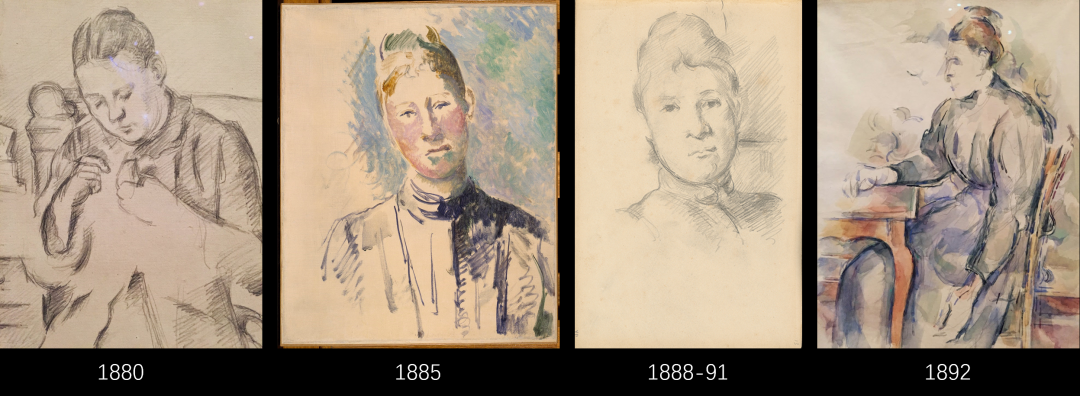 塞尚所作的夫人肖像跨越了20年的时间,在每一张作品中她都有所不同。虽然她总是坐着,但她时而像是一位忧郁的圣母,时而像一位严厉的校长,时而像是一个胸部平坦的雌雄莫辩的男孩。大都会博物馆的展览使四幅戏剧性的画作重新聚到了一起,俗称为“穿红裙的塞尚夫人”。