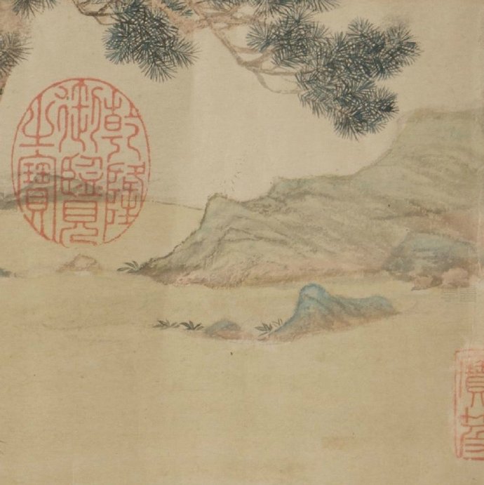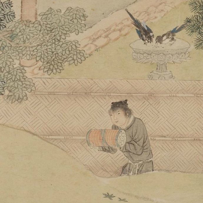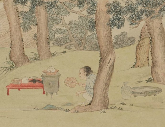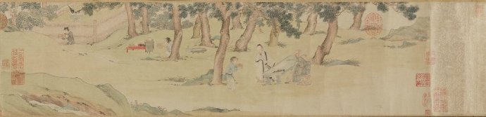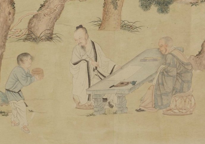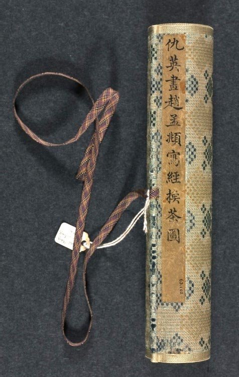 书画合璧《赵孟頫写经换茶图卷》 仇英作画,文征明写《摩诃般若波罗密多心经》。本画描绘赵孟頫写般若经与和尚换茶的故事。