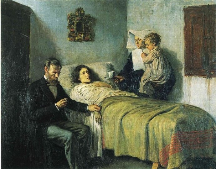 毕加索的父亲唐霍塞,破天荒地亲自做模特儿,于是他就成了画面左边坐在病人床旁的医生。唐霍塞一生拘谨踏实,极少照相,后人也许只能通过这位“医生”来想像他的模样了。儿子毕加索充分借鉴流行的印象派的技巧,在以赭色、棕色表现悲悯和忧郁的同时,映衬着紫红、黄绿诸色,从而一扫伤感颓靡之风,画面成熟稳重,泰然自若,虽然尚没有摆脱学院派的影子,却也对未来的风格有所预示。比如,病妇那只柔软细长的手,就好比一段安详优美的语言,在款款倾诉。