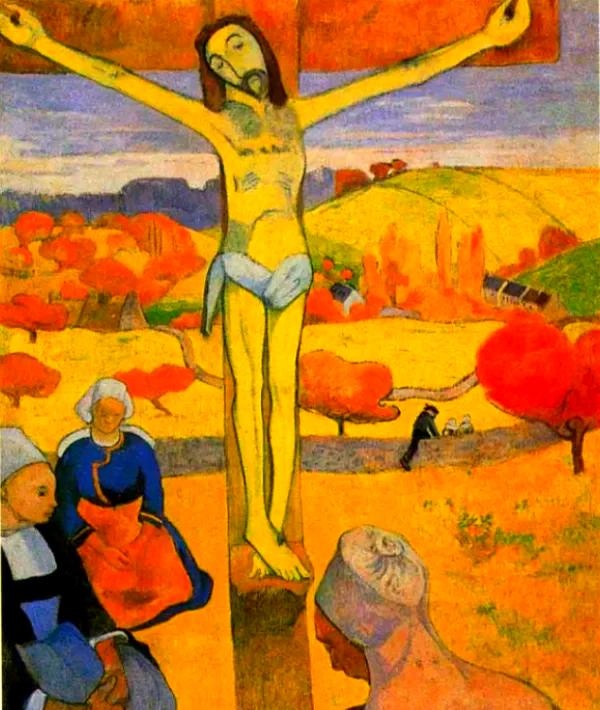 据说,画中的黄色基督像是有现实根源的,那个十字架就是参照着阿旺桥附近教堂里的一件着色的基督受难木雕像所描绘的。也许是因为黄色在西方象征阴郁、猜忌、怯懦,这幅名画在初展时受到了许多责难。其实,我们更应当注意到,基督像的黄色在作品中也正是麦田的颜色,更为具体地说,基督上身阴影中的绿色,与山坡有点泛绿的麦田相同,而基督下身的颜色则与山岳下那一片麦田的颜色是相同的,它比围墙外边表现荒地杂草的桔黄要纯净、明亮;可以说基督身上的颜色与麦田的颜色几乎是完全对应的,其目的就在于彰显黄色的真正意义——