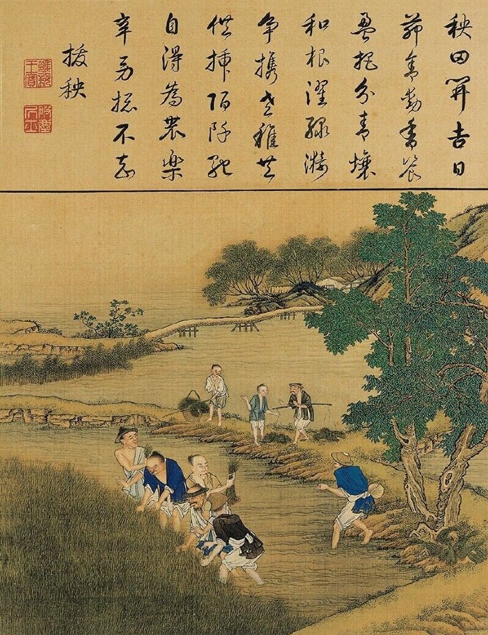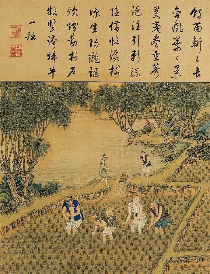 《雍正耕织图》是雍正登基以前以康熙年间刻版印制的《耕织图》为蓝本,由清宫廷画师精心绘制而成。