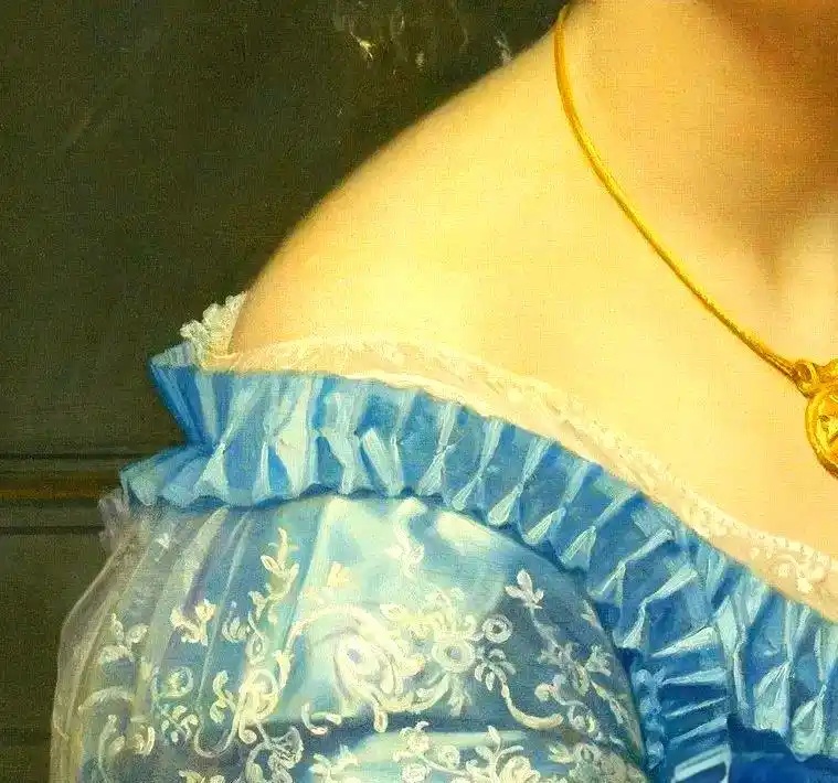 《勃罗日里公爵夫人像》,亦被称为《布罗格利公主》,生动描绘了一位优雅贵妇形象。画中精巧的细节、流畅的线条以及清纯的色彩,无不展现出安格尔独特的艺术风格。通过对面部与物件的细腻描绘,展现了其精湛的绘画技艺,画面造型饱满圆润,线条流畅柔美,色彩清纯恬淡,共同衬托出女主人公的高雅气质。模特儿裸露的削肩以及胸部至腰部的巧妙构图,体现了安格尔独特的艺术匠心,使得整个画面更加和谐统一。