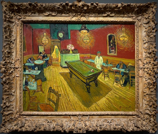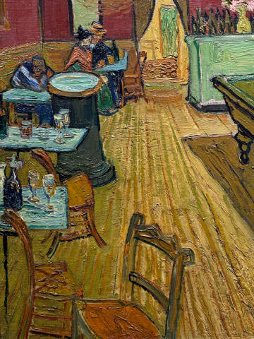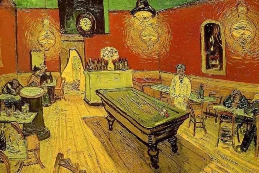 梵高从1888年的5月到9月都借住在兰卡散尔咖啡馆,由于咖啡馆通宵营业,因而被称之为“夜间的咖啡馆”。此刻的梵高已慢慢地在画面上显露出他那种繁杂而不安、彷徨而紧张的精神状况。