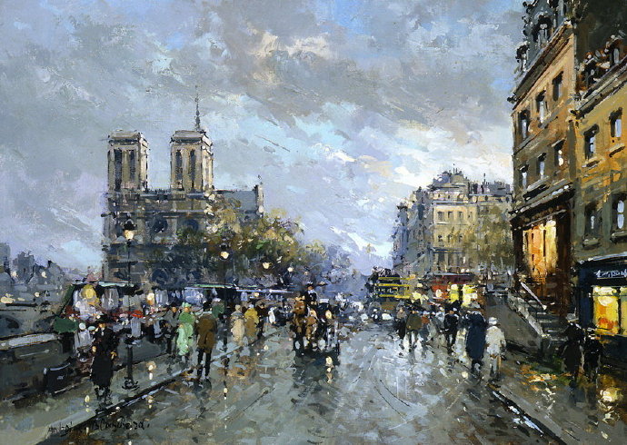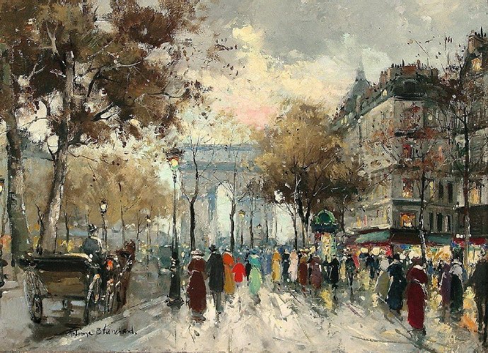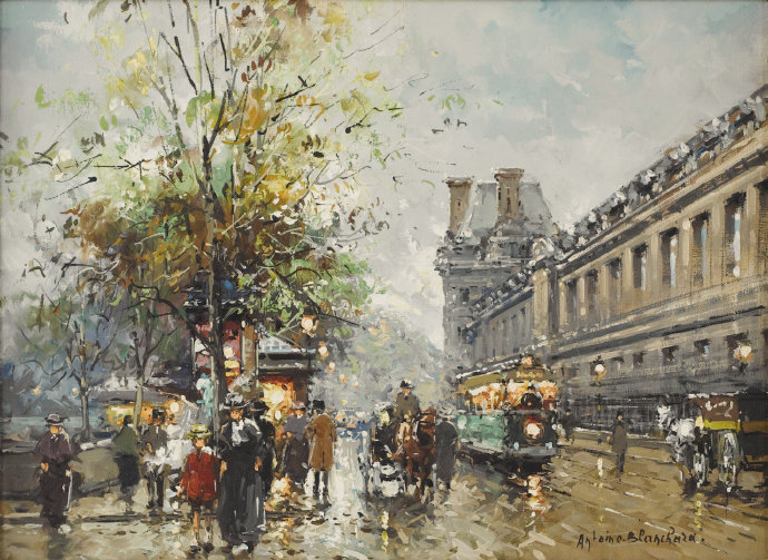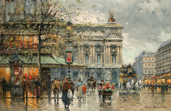 法国画家Antoine Blanchard笔下浪漫的巴黎。Blanchard 曾获得过罗马大奖,他的作品主要描绘不同季节和天气之中巴黎的美丽街景,喧嚣热闹的大街,有着明亮灯光的店铺,熙熙攘攘的人群是他画作的主要主题。