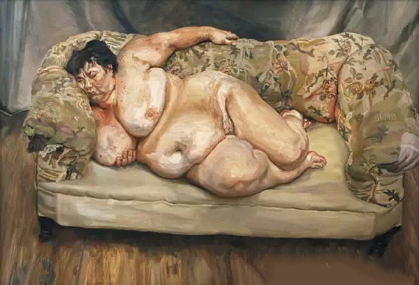 与那些嘲笑肥胖者的电视节目相比,弗洛伊德笔下的女人肉体远没有那样残酷。事实上,这个女人的姿态和谐慵懒,她将脖颈后仰,这种引人注目的仪态令人感到她正沉迷在自我之中,抑或是享受一片安逸宁静。