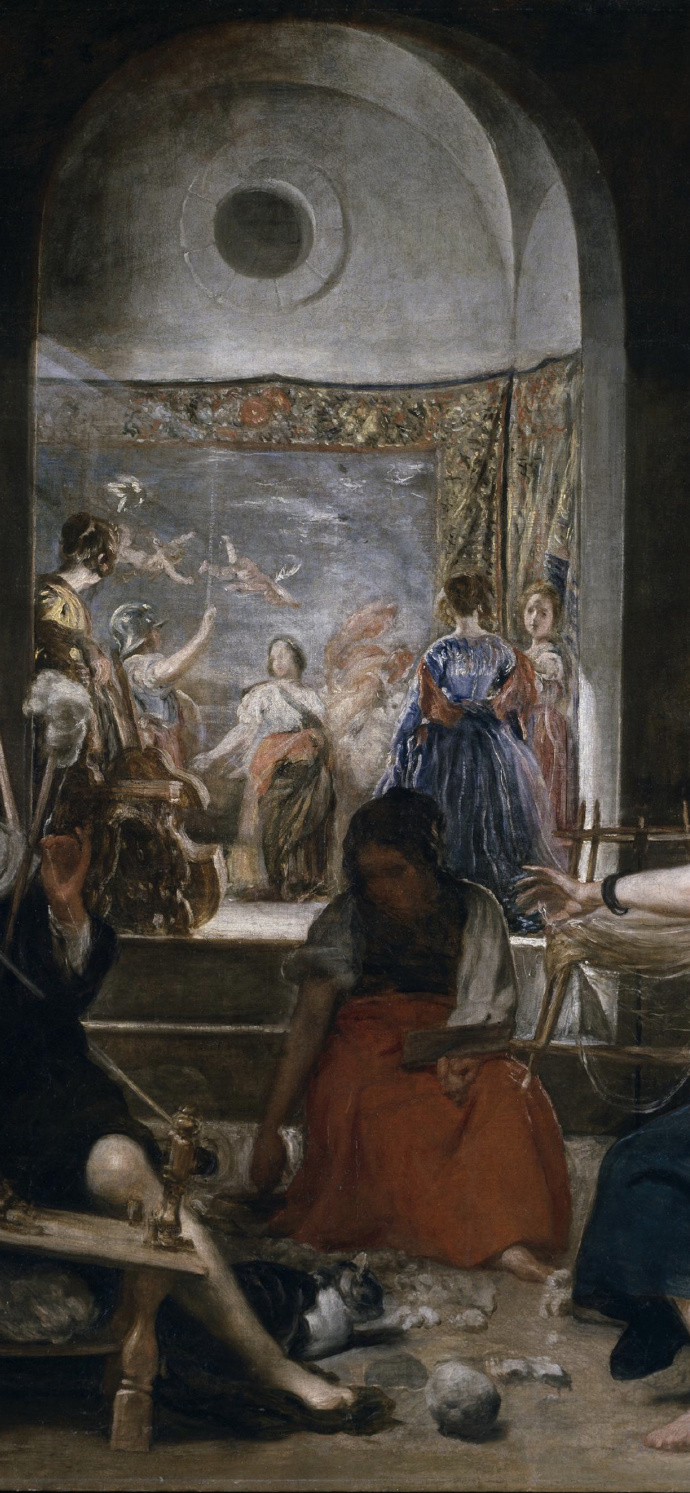 这是委拉兹凯支晚年最主要的作品之一,画中描绘了两个不同的阶层:一边是正在悠闲欣赏壁毯的宫中贵妇,一边是马德里皇家织造厂繁忙而疲惫的女工