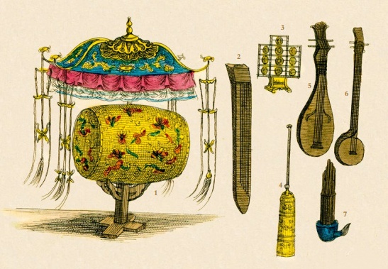 3. 云锣,一种扬琴或编钟,由 10 个铜管乐器组成。中国人有时会用前面提过的响声石制造出效果相似的乐器。