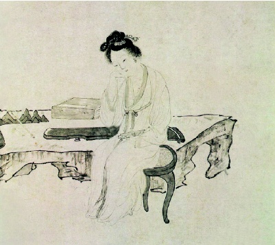 画中描绘一女子武陵春坐于石岸前,低头深思。武陵春是一位诗书画曲皆有造诣的才女,对待爱情坚贞不渝。构图简洁,画面明朗,图中放置古琴、笔墨纸砚、梅花来烘托该女子的品德和修养。