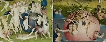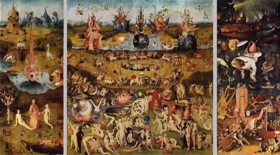 博斯一生中画了三幅可以按顺序从左至右阅读的三联画,其中每一幅的中心面板都必不可少。这三部作品主题独特而又相互联系,涉及历史和信仰。从这一时期的三联画来看,左侧和右侧面板通常描绘伊甸园和最后的审判,而中心面板则包含主要的拍摄对象。尽管普遍认为这幅《人间乐园》的“花园”部分可能作为祭坛使用,但考虑到其极端题材,这幅画作的目的更可能是为外行人士而非教堂或寺院。