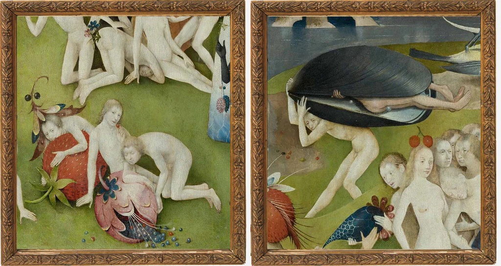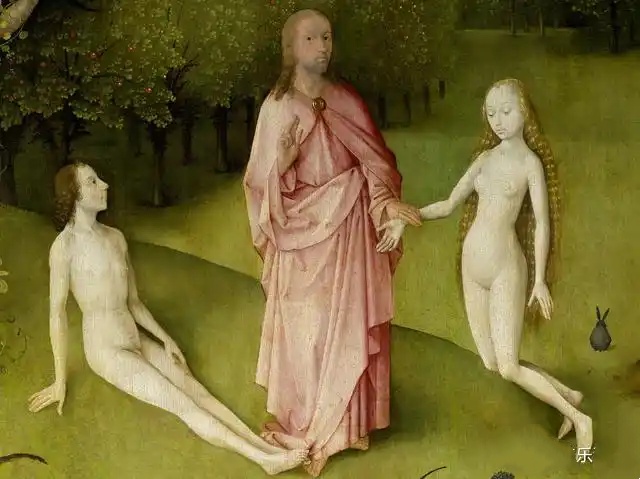 左侧部分:描绘了上帝创造亚当和夏娃的场景,象征着人类的起源与纯真。这里的色彩鲜艳,充满生机,展现了人类与自然和谐共处的美好时光。