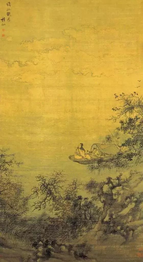在此画中,一轮秋月悬挂在画面左上方,画面右下方的小舟上,坐着正举杯对月的“谪仙”李白。画家用流利的细线勾勒,然后用淡绿色略加晕染,将激流旋涡、惊涛拍岸的水势描绘得淋漓尽致,并与江上行舟和天上飞云构成一种强烈的动感。画中人物形象用笔粗率简括,抬头望月的神态表现得惟妙惟肖。