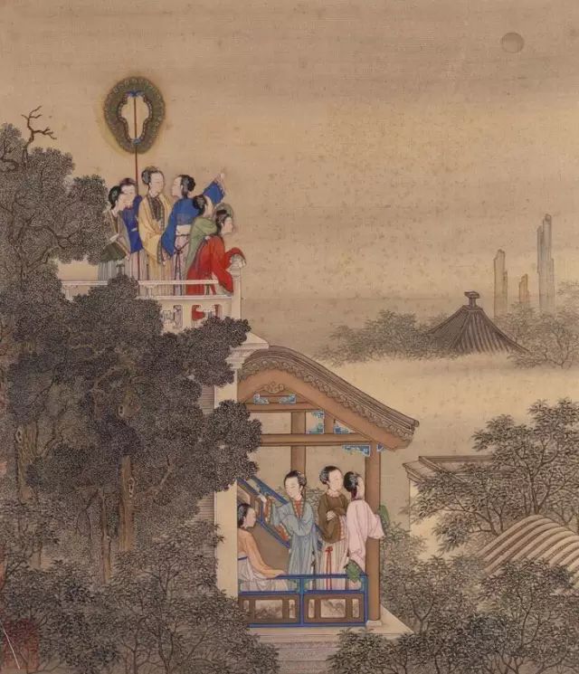 描绘中秋之夜,贵妇们聚集高台,吟诗赏月的情景。画面体现了宫廷生活与民间生活的密切关联。作者在人物创作的审美取向上以明代唐寅、仇英笔下的仕女画为审美标准,追求秀润飘逸的情致。她们三五成群地行进在以界画表现的亭台楼阁内或是细笔勾染皴点的花石下。富贵闲逸的宫苑生活令她们的物质生活十分充足,也使她们的精神世界极度贫乏。