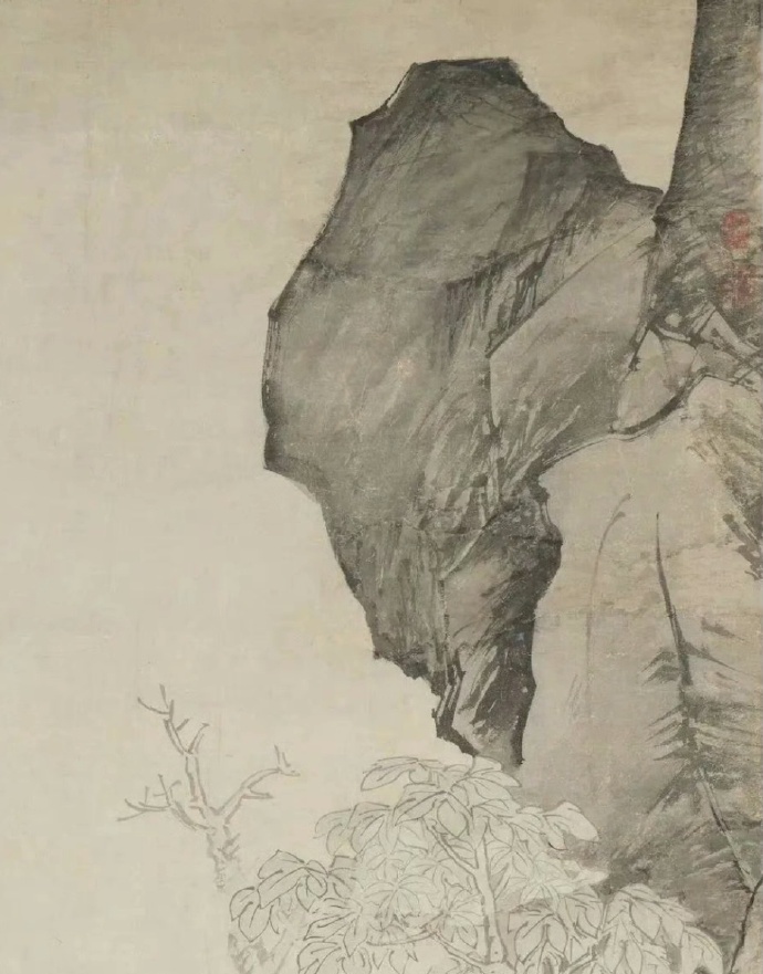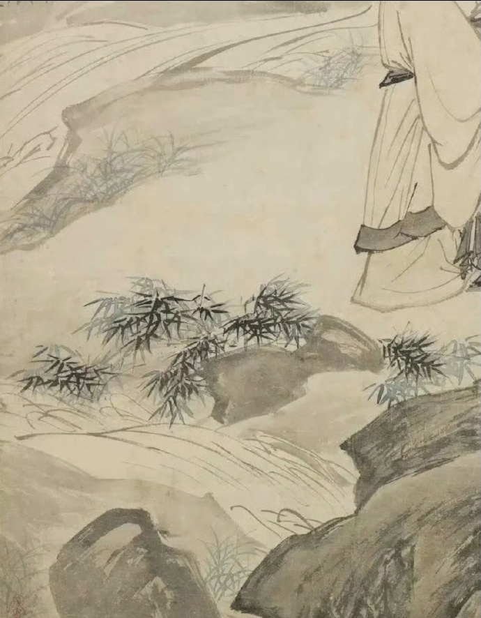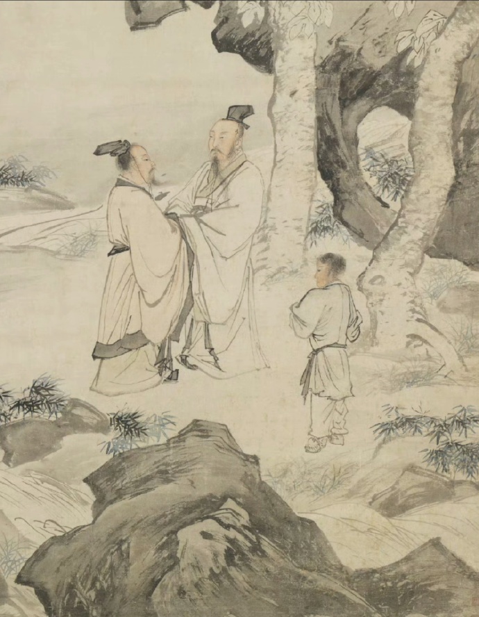 幅中画溪流之间,梧桐树下,两人执手相谈,表达文人生活雅趣。画山石笔势潇洒纵逸,墨调对比较强。画人物也是笔法快速,挺拔劲健,但不失温雅。本幅与院藏“蕉阴结夏”可能原为同套四屏之一,是应项元汴所请而作,为装饰厅堂之用。