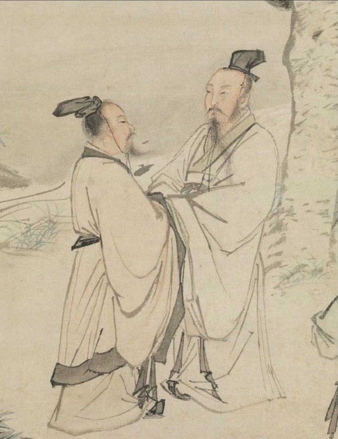 幅中画溪流之间,梧桐树下,两人执手相谈,表达文人生活雅趣。画山石笔势潇洒纵逸,墨调对比较强。画人物也是笔法快速,挺拔劲健,但不失温雅。本幅与院藏「蕉阴结夏」可能原为同套四屏之一,是应项元汴所请而作,为装饰厅堂之用。