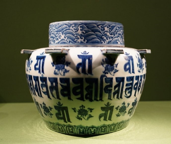 罐直口,短颈,平肩,鼓腹,下部微向内收,平底,肩部有八个长方形平板出戟。罐外壁自上而下分层饰海水纹、八吉祥纹、蓝查体梵文和莲瓣纹等;内底双线圈外,九个莲瓣内各书写一梵文,双线圈内自左向右署篆体"大德吉祥场"款。