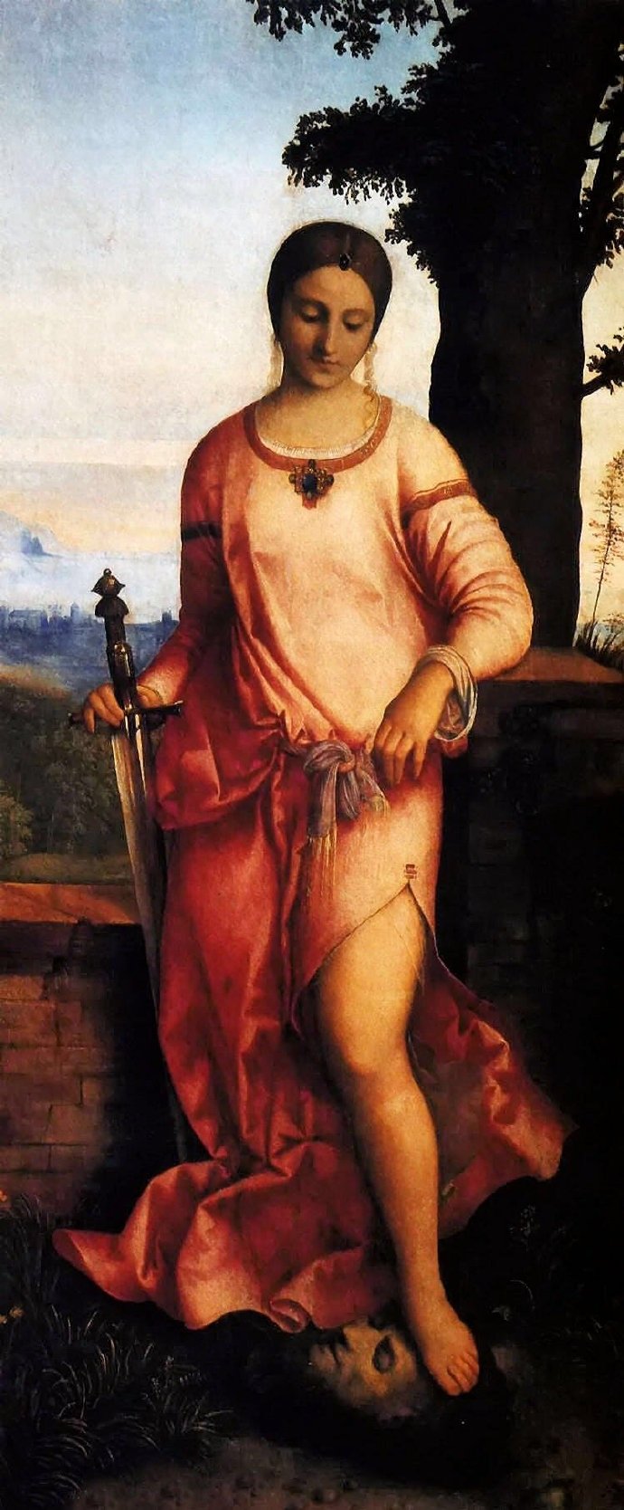 现收藏于:圣彼得堡,艾尔米塔什博物馆 Hermitage. Petersburg 《朱提斯》是画家乔尔乔内在1510年创作的一幅油画,起初是在木板上绘制的,后来被移到画布上 。据《旧约,经外书》载,朱提斯是爱国的犹太女英雄,并且被看作古代犹太人在近东遭受压迫时反抗的象征。在艺术中,她的形象经常是拿着亚述将军赫罗费恩( Holofernes)的首级——她曾亲手割下他的头。亚述的军队曾经围攻犹太城市贝都利亚,当城内无法支持将欲投降之时,一个富有而美丽的寡妇朱提斯设下一计,拯救了全城。她知道“无论任何男人,只要看她一眼就会被抓住”,于是带着侍女进入了亚述人的军营。她伪称本城人驱逐了她,因而被敌营将领赫罗费恩所接受,她又编造了一些进军犹太城的计策蒙骗敌人,于是得以在敌营中住了几天。赫罗费恩对她产生了爱慕,邀请她参加宴会。酒宴之后,赫罗费恩单独留下她,虽意图诱惑,自己却已酩酊大醉。朱提斯见时机已到,便立即抽出利剑,斩下了他的人头。她的侍女用备好的口袋装起人头。二人趁事情未被发现,连夜赶回贝都利亚。当凶讯传出后,亚述营中大乱,以色列人奋力出击,敌人望风而逃,犹太人转败为胜朱提斯的形象最早出现在中世纪,是作为美德战胜恶德的象征,并且可能伴以谦恭的寓意。文艺复兴时期创作了有关朱提斯的大量作品,她得胜的场面常常与“参孙与大利拉”或“亚里土多德与康帕丝贝”的画幅并列在一起。