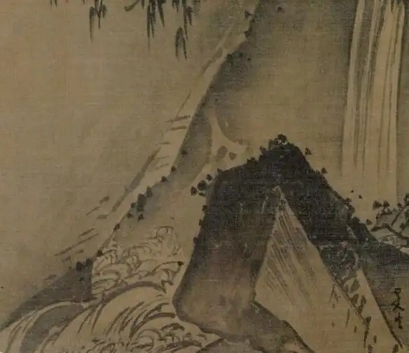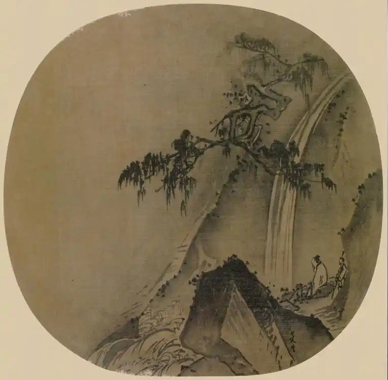 再次,瀑布从上到下贯穿整个画面,但瀑布落地击石的画面被山石挡住,给观者带来无限的遐想,而画中观瀑布的人视线也刚好在这里。