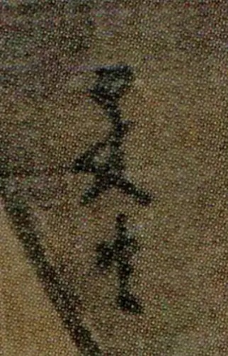 其次,松树下面有两个人,一个坐在石头上,双手扶膝,低头向下观望;另一个站在后面,双手合并置于身前,部分身躯被山石挡住。二者身高比例一大一小,根据古人作画习惯可以判定二者是主仆关系。