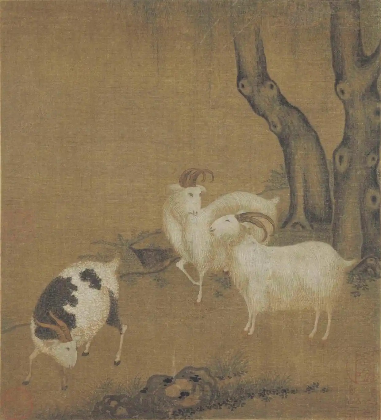 《三羊图》作者宋代佚名,绢本设色,尺寸21.2厘米 x 20厘米,现藏于北京故宫博物院