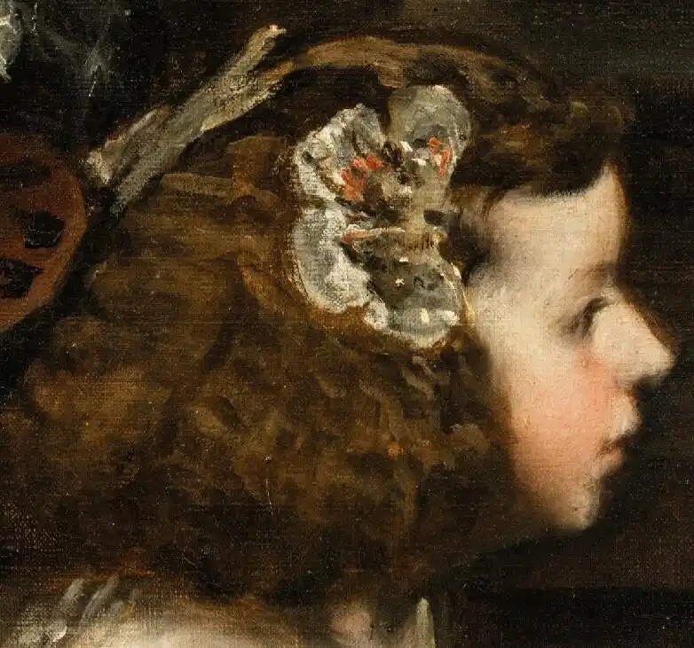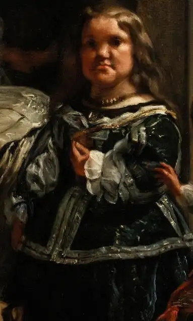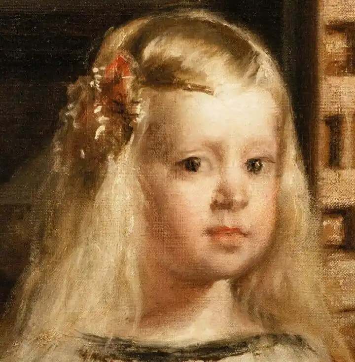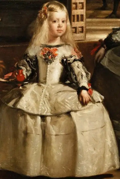 小公主玛格丽特·特蕾莎端坐于场景中心位置,玛格丽特·特蕾莎是西班牙国王费利佩四世的女儿,出生于1651年7月12日,被严格按照马德里宫廷的礼仪抚养长大,受到了良好的教育,画面中的她才5岁左右。