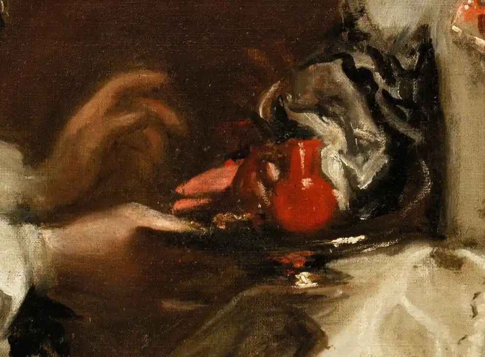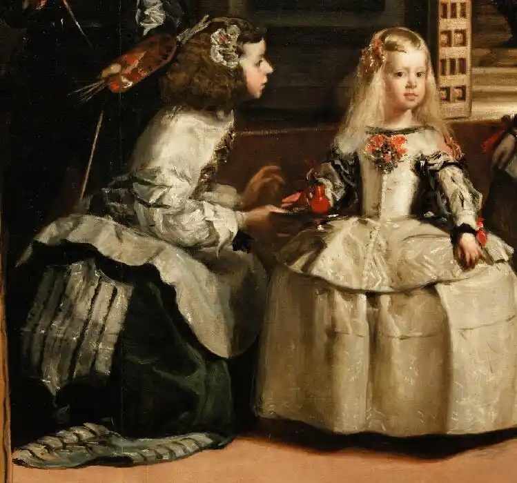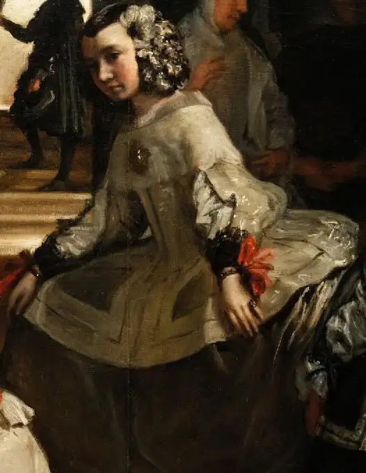 小公主玛格丽特·特蕾莎的右手边是她的侍女玛利亚,玛利亚跪于地面,上身前倾,双手呈上放有红色瓷瓶的银盘,关怀备至的注视着小公主。