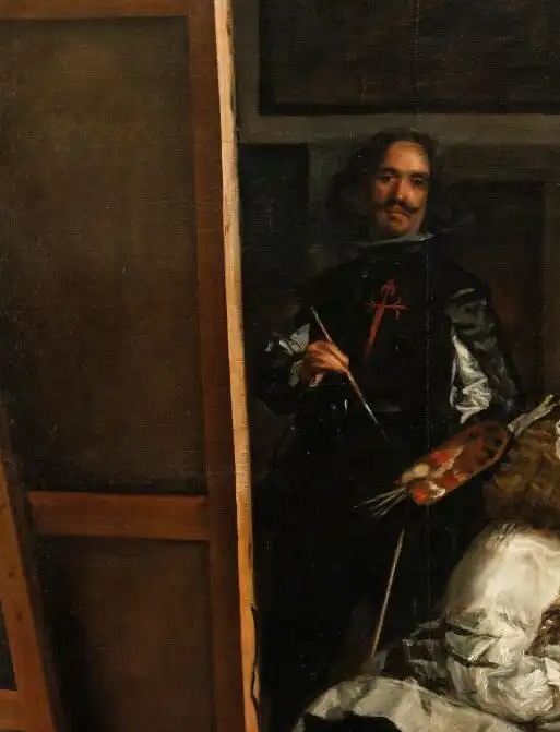 画面最左边是正在画架前作画的委拉斯凯兹,能将自己画在皇家的画面中,可见画家与国王之间的关系不一般。国王继位第二年(1622年)就招募委拉斯凯兹为宫廷画师,50年代后,委拉斯凯兹又当上了宫廷总管,从国王府邸的室内布置,到宫廷的庆典活动,他都要亲自过问。画中委拉斯凯兹目视前方,右手拿笔,左手拿调色盘和其它画笔,穿深色服装,胸前有圣地亚哥骑士团徽章。这是一个大臣能够得到的最高荣誉,也是西班牙有史以来,第一位获封骑士的画家。