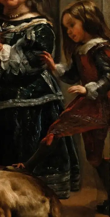 画面最右边是弄臣波图萨托,弄臣是古代宫廷中以插科打诨来为君王消烦解闷的人物,一般为侏儒、小丑或能人异士等。画中的波图萨托,左脚踩在闭目而憩的西班牙马士提夫犬身上,显得非常顽皮,甚至非常顽劣,这也充分说明弄臣在宫廷中是享有一定言行自由的。
