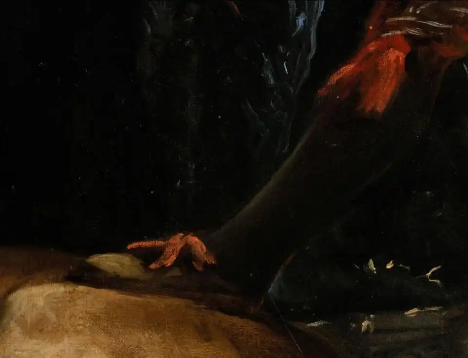 最后,《宫娥》的最大彩蛋在于画面视角,通过镜像可知,这幅画是国王的视角(王后的视线不在前方),而画家的视线正对国王,画家通过国王的视角展现出了宫廷里的生活场景。另外,画面的左下角还留有画家的笔迹。