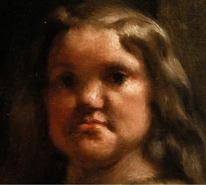弄臣波图萨托与侍女伊莎贝尔之间是玛丽芭波拉,玛丽芭波拉面相成熟,但身高矮小,左臂发育畸形,显然患有侏儒症。当时的皇家为了后代血统纯正,推崇皇室家族内部联姻,由于当时对近亲结婚的认知处于盲区,致使其后代多出现先天性疾病。侏儒常作为弄臣陪皇室消遣时光,在其主人眼里就是一个高级宠物。