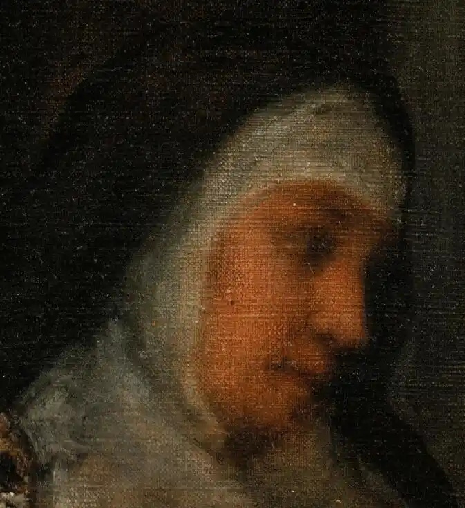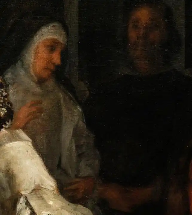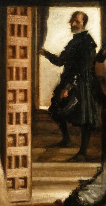 画面右边第二排(侍女伊莎贝尔的身后)站有一对夫妇,女的为保姆侍从马塞拉,马塞拉身着修女服饰,转头对其丈夫若有所语。