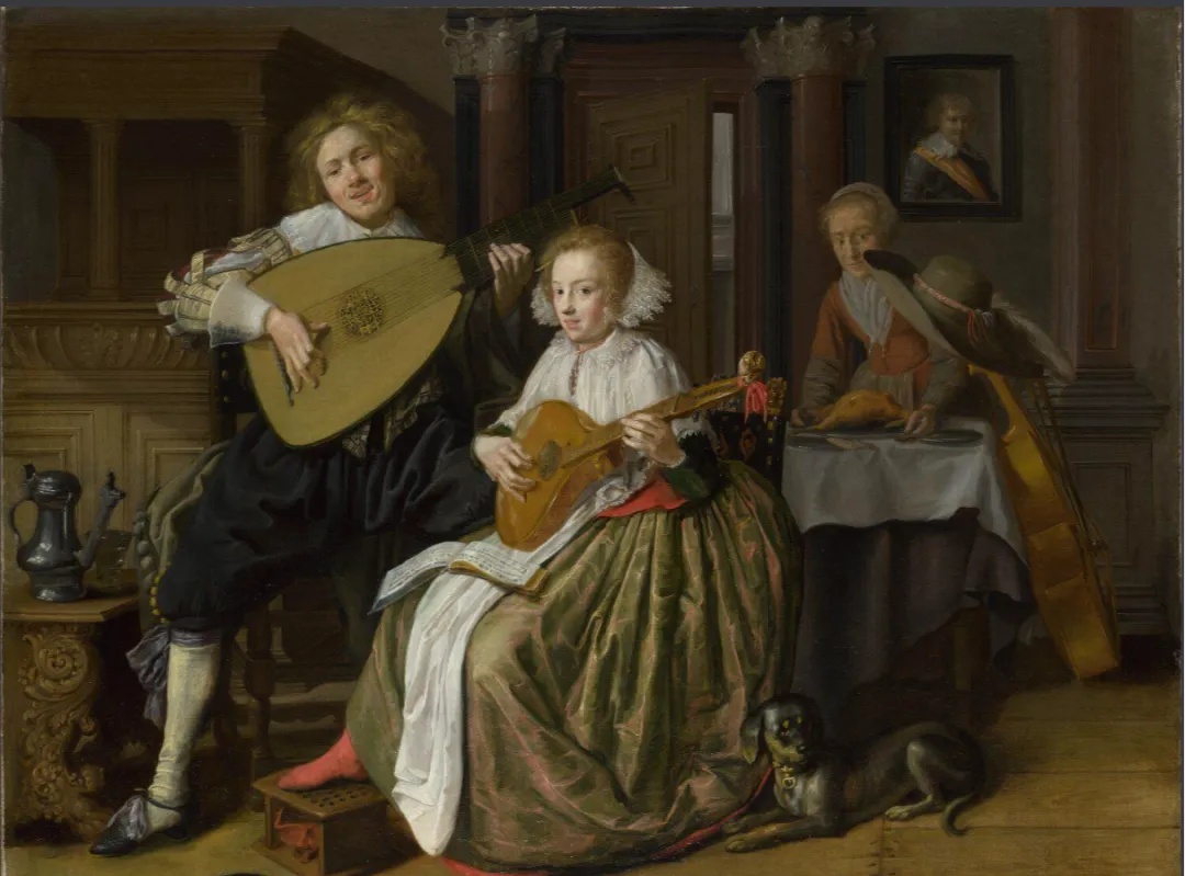 这就是16世纪的“吉他”? 01 这幅颇具喜剧感的画作来自荷兰黄金时代的风俗画画家Jan Miense Molenaer(1610—1668年),名为《一位年轻男子演奏西奥伯琴,一位年轻女子演奏西特琴》 画中,一对幸福的年轻夫妇正在一间优雅的镶板房间里演奏音乐。年轻人悠闲地坐着,他修长的手指拨动着西奥伯琴的琴弦——这是一种古老的乐器,现在很少有人演奏;年轻女子演奏的则是西特琴,这是一种比较容易掌握的乐器。 西奥伯琴属于鲁特琴大家族,是一种弹拨乐器,具有加长的琴颈和第二个弦轴盒。西奥伯琴起源于16世纪晚期的意大利,当时佛罗伦萨卡美拉塔(Florentine Camerata)的歌剧和使用低音连奏的新音乐作品,如朱利奥·卡奇尼(Giulio Caccini)的两部作品集都要求使用音域更宽的低音乐器,音乐家最初使用大型低音鲁特琴和更高的凹入调音;但很快就创建了带有辅助弦轴的琴颈延伸部分,以容纳额外开放(即无品格)的较长低音弦,称为音叉或波登,以提高音调清晰度并增加可用音符的范围,西奥伯琴便这样诞生了。 与鲁特琴一样,西奥伯琴也有一个带有木质顶部的弧形音箱(空心箱),通常带有音孔,以及从音箱伸出的琴颈。演奏者用一只手拨动或拨动琴弦,同时用另一只手“按动”(按下)琴弦;按下琴颈上不同位置的琴弦会产生不同的音高(音符),从而使演奏者能够演奏和弦、贝斯线和旋律。 而西特琴则是文艺复兴时期的一种弦乐器,虽然现代学者对其确切的历史存在争议,但普遍认为它是中世纪西特里琴(citole,一种中古吉他式乐器,通常有四根弦)的后代。它的平背设计比鲁特琴更简单,造价也更低;同时它也更容易演奏,体积更小,更便于携带。不同社会阶层的人都会弹奏西特琴,它是一种很受欢迎的休闲音乐创作乐器,就像今天的吉他一样。 如今,西特琴家族以科西嘉乐器(Corsican cetara)和葡萄牙吉他的形式幸存下来。葡萄牙吉他通常用于演奏流行的传统音乐法多(fado)。20 世纪 70 年代初,英国制琴师斯特凡-索贝尔(Stefan Sobell)以吉他和一把 20 世纪 30 年代的拱顶马丁吉他为模型,创造了一种 “西特琴”,这是一种主要用于演奏民谣的混合乐器,深受民谣复兴音乐家的喜爱。